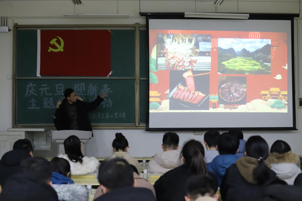 值此华夏神州年轮新添、时代航船破浪扬帆之际,为继承和弘扬中华民族优秀传统文化,彰显文化自信,积极推进社会主义文化建设,2019年12月30日ac米兰官方网站学生第二党支部在主教学楼B129教室开展“庆元旦 迎新春”主题党日活动。活动由支部书记丁于娟主持,学生第二党支部全体党员参加。