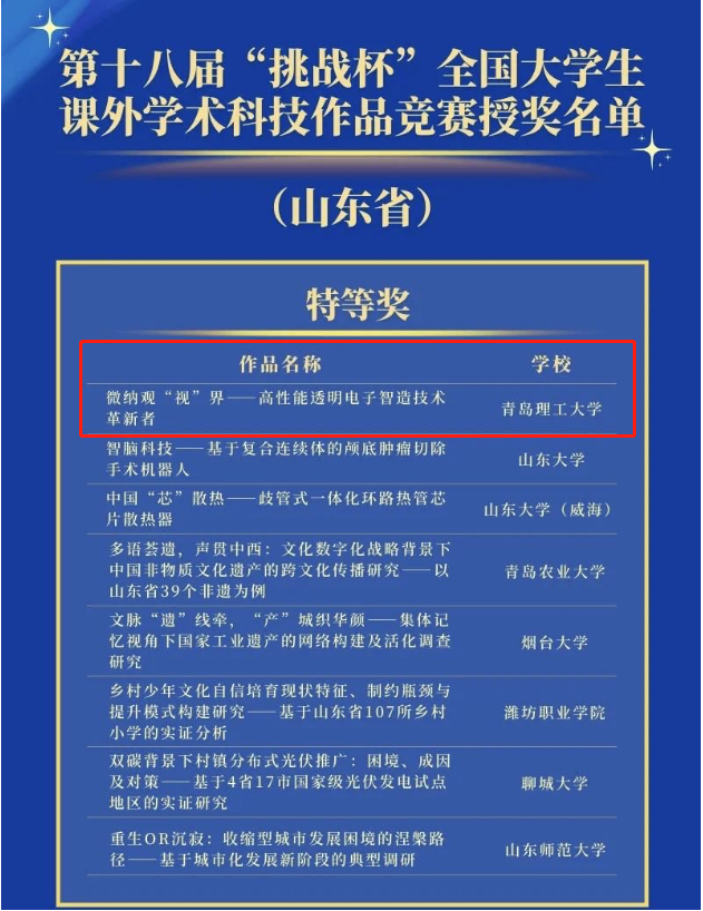 10月30日,第十八届“挑战杯”全国大学生课外学术科技作品竞赛在贵州大学落下帷幕,经过激烈角逐,ac米兰官方网站参赛项目《微纳观“视”界——高性能透明电子智造技术革新者》(指导教师:朱晓阳、兰红波、杨建军;团队成员:王瑞、周君仪、段培开、张友超、商帅、台玉平、于志浩、张金宝)勇夺主体赛全国特等奖,创造了米兰官网在此项竞赛中首次获特等奖记录。此项成绩也是青岛理工大学在“挑战杯”系列竞赛中的最好成绩,实现了赛事重大突破。
