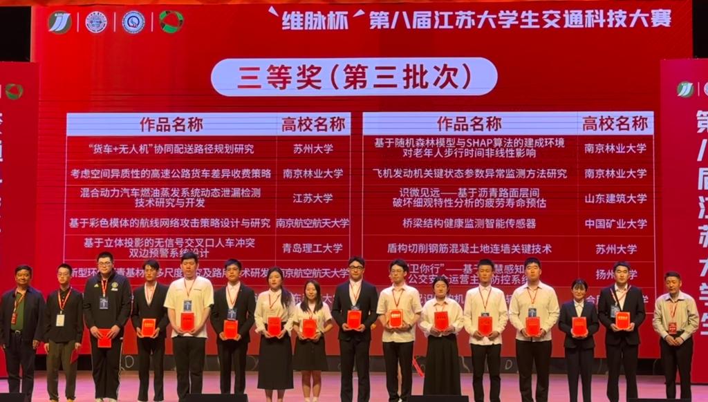 近日,由教育部高等学校交通运输类教学指导委员会交通工程教学指导分委员会指导,江苏省城市科学研究会、江苏省城市规划研究会、南京市科学技术协会、南京市综合交通运输学会主办,苏州大学、苏州市综合交通运输学会共同承办的“维脉杯”第八届江苏大学生交通科技大赛决赛在苏州大学天赐庄校区举行。ac米兰官方网站共有两支队伍入围决赛,经现场答辩,研究生团队参赛作品获得三等奖;本科生团队参赛作品获得优秀奖。