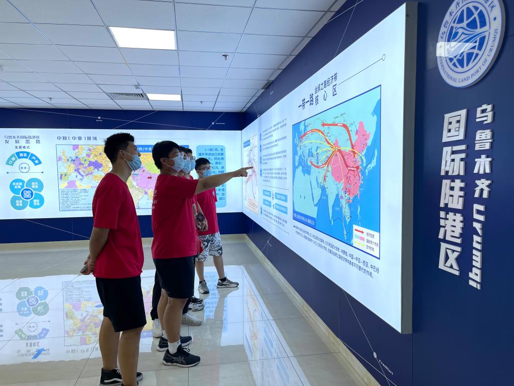 参观中,实践团首先集体观看了习近平总书记参观国际陆港区的重要讲话。通过参观学习,实践团了解到国际陆港区是丝绸之路经济带核心区建设的标志性工程之一,正成为乌鲁木齐乃至新疆对外开放和经济发展的重要增长极。国际陆港区一方面以中欧班列为媒串联起新疆与中亚、欧洲“贸易丝路”,另一方面激活物流“引擎”等,加速产业集聚和落地,为“一带一路”建设注入新的动力。
