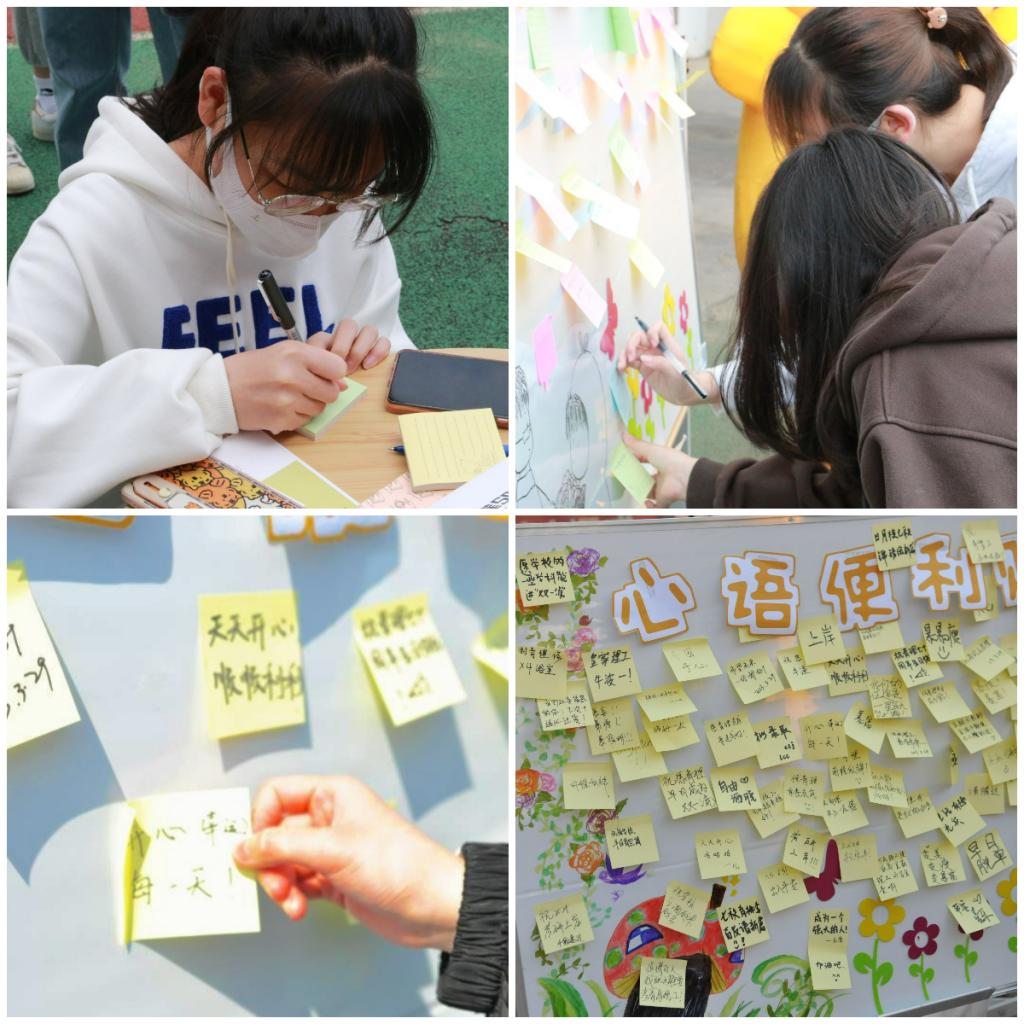 回望70年,传递幸福。“在日常谈心谈话中,很多学生缺乏人际交往能力,希望通过‘心愿卡’让学生直抒胸臆,表达真情实感。”2022级辅导员代莉说到。在“幸福传递区”,同学们纷纷用便利贴写下对自己、对家人、对朋友、对未来的美好憧憬及衷心祝福,有文字、也有简笔画,舒缓心情,幸福前行。更多同学写下了对学校的美好祝愿,热切期盼70周年校庆顺利举办。“接下来,我们会把幸福便利贴收集起来,分类整理、择优进行展示,让幸福的声音传的更远、更广。”学院心理联络员吴静说到。