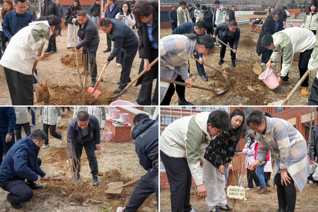 在图书馆西侧草地,老师们与各民族学生分组协作,挥锹铲土,共同栽下一棵棵石榴树,一起种下中华民族共同体意识的“树苗”。后勤管理处党总支书记王龙向在场学生说:“我们种植的这片石榴林,既是用劳动实践丈量知行合一的‘田间课堂’,更是将个人理想嫁接国家战略的‘成长苗圃’。新时代青年正如这满园石榴相拥成林,各学生如石榴籽般紧紧相拥,在共同浇灌的青春岁月里孕育出中华民族一家亲的参天大树!