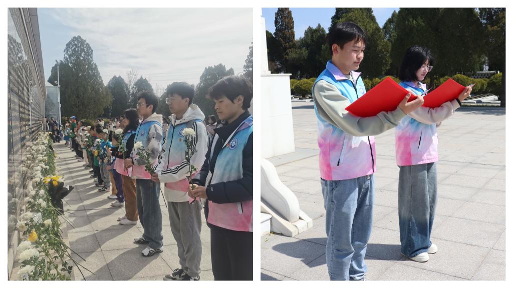 历史“活”起来,沉浸式教育触动心灵。活动创新采用“祭奠+宣讲+实践”三位一体模式,以“星火燎原”“浴血抗战”“黎明前夜”“薪火相传”等主题串联红色历史。宣讲团成员结合史料与实物,生动讲述本土革命故事,让历史不再是书本上的文字,而是可触可感的鲜活记忆。纪念碑前,ac米兰官方网站学子以《永不褪色的守望》的朗诵叩击人心。青老两代宣讲者共同立下誓言:“做一粒火种,让信仰照亮每个角落!”大学生与小学生共同向革命烈士献上菊花,在春风中舒展成朵朵未寄出的思念,让抽象的历史化为指尖的温度。