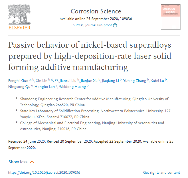 米兰官网青年教师郭鹏飞博士联合西北工业大学黄卫东教授、林鑫教授团队和南京航空航天大学曲宁松教授团队,开展了航空发动机用镍基高温合金典型牌号Inconel 718合金(国内牌号为GH4169)的高沉积速率激光立体成形实验。基于激光熔池形貌及温度场数值模拟,揭示了高沉积速率条件下沉积态组织织构的演化规律;通过观察钝化膜的原子尺度结构、成分特征,利用点缺陷模型(Point Defect Model)理论,阐明了钝化膜诱导沉积态试样电化学活性各向同性的作用机理。相关成果以题为“Passive behavior of nickel-based superalloys prepared by high-deposition-rate laser solid forming additive manufacturing”的论文发表在材料腐蚀领域顶级期刊《Corrosion Science》上。论文链接:https://doi.org/10.1016/j.corsci.2020.109036。论文第一作者为米兰官网ac米兰官方网站郭鹏飞副教授,第一署名单位为青岛理工大学山东省增材制造工程技术研究中心。该研究得到了科技部国家重点研发计划项目(No. 2018YFB1105901)的支持。
