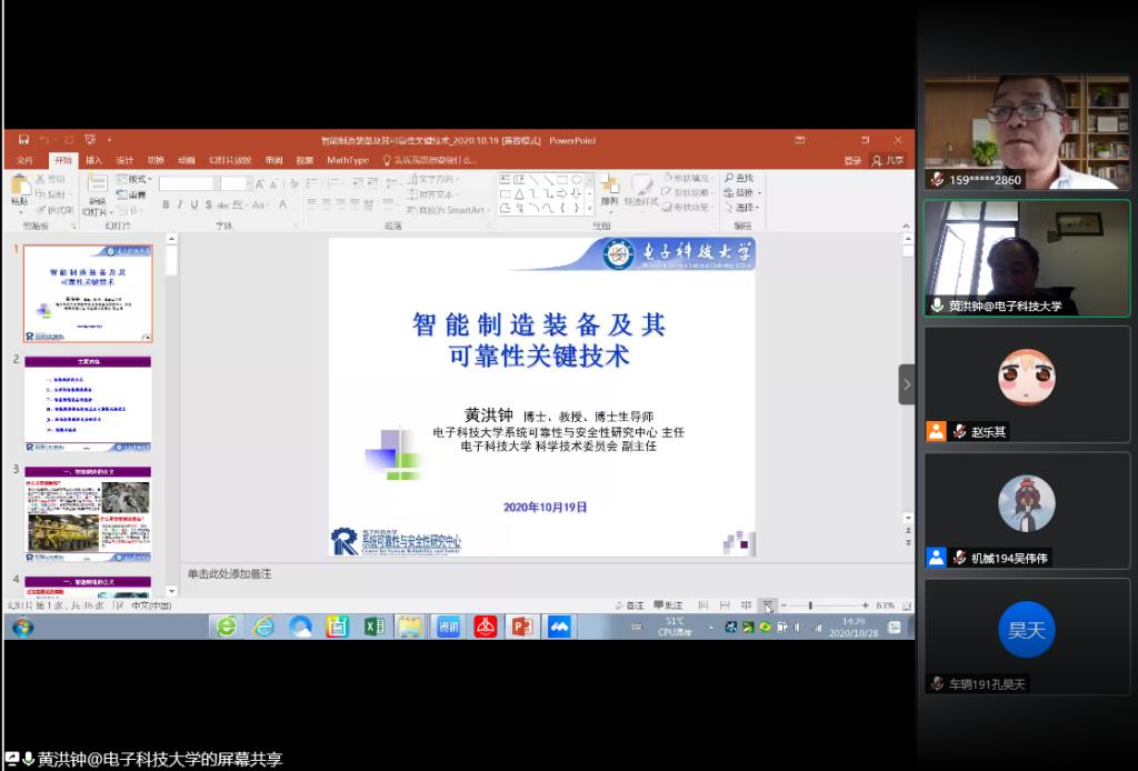 10月28日,ac米兰官方网站第35期“匠心机车讲坛”开讲,本期讲坛特邀电子科技大学系统可靠性与安全性研究中心主任黄洪钟教授通过线上腾讯会议的方式做了题为“智能制造装备及其可靠性关键技术”的学术报告,ac米兰官方网站学术委员会主任林天然教授主持报告会, 200余名教师、学生通过线上方式聆听报告。